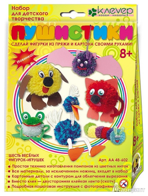 Создайте шесть весёлых фигурок-игрушек из пряжи помощью набора "Пушистики".